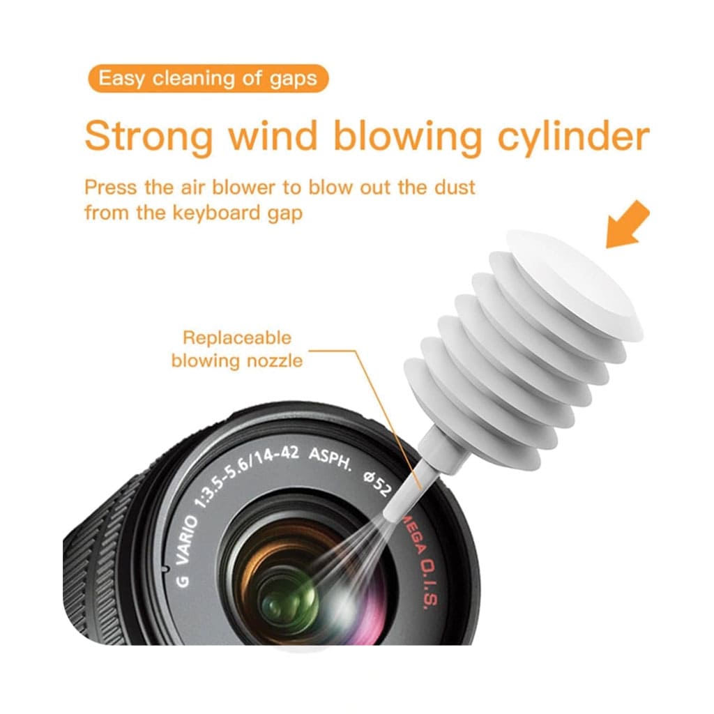 - یک دمنده کوچک که با فشرده شدن بین دو انگشت حجم بالایی از هوا را از طریق نازل خارج می کند و انواع ذرات گرد و غبار را از درز و شکاف های دور از دسترس پاک می کند.